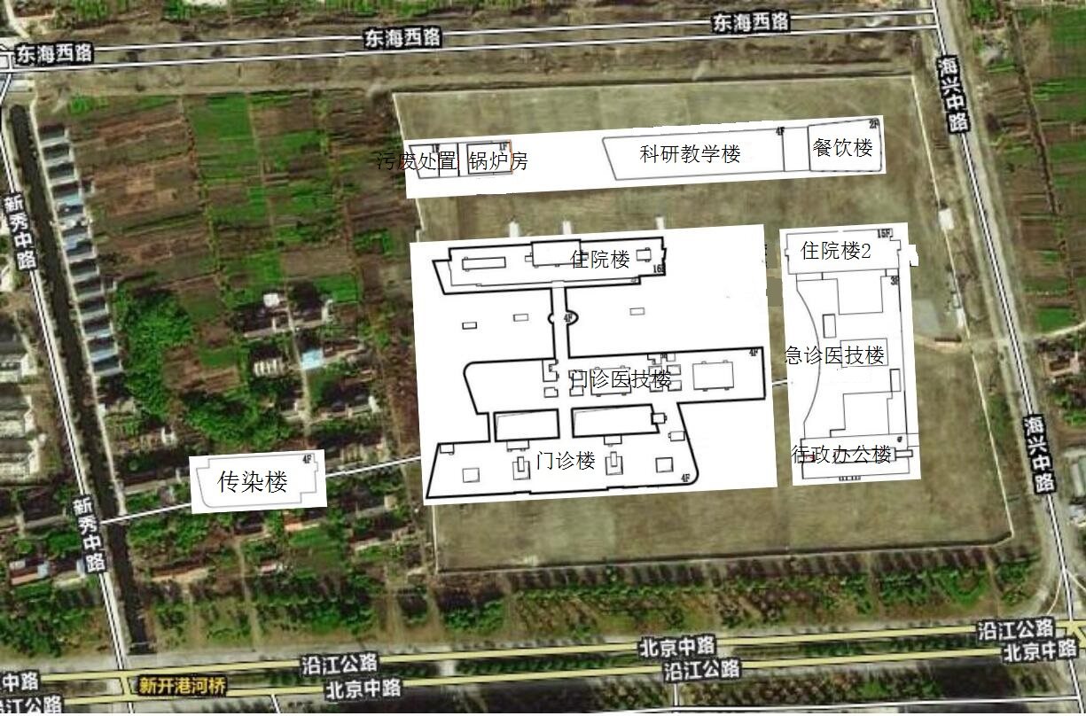 - 本工程位于海门市岷江路以东、海兴路以西、北京路以北、东海路以南,总建筑面积为75883m²。本工程按三级医院规模建设,内容包括急诊医技办公住院楼、科研教学餐饮楼、传染楼、锅炉房、污废处置房、门卫、连廊等单体建筑。