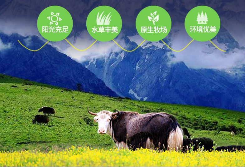- 牦牛属地球之巅的高寒、独特的半野生半原始珍稀动物,与北极熊、南极企鹅共称为“世界三大高寒动物”。长年生活在海拔3000 米以上高寒地带,抗寒能力特别强,体质粗壮结实,可以在零下38 ℃下生存。玉树草原有世界上罕见的洁净未受任何污染、没有化学肥料和农药的危害,空气清洁的自然环境,牦牛逐水草而居,一生中摄入大量的虫草、贝母等名贵中草药,使牦牛肉质细嫩,味道鲜美。