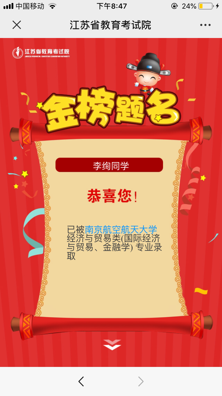 祝贺李绚同学金榜题名!